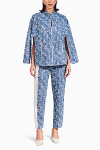 Featuring the Passion Denim Co-ord Set from House of Zeniaa's Rodeo Blue Collection. This stylish coord set includes a front-open denim cape with a zip closure, paired with color block denim pants for a flattering look. Style it open with a bustier and classic pumps for any party.