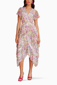 Your new yet fancy -yet -cool way to dress in happiness! The pastel hue delicate floral dress has every single detail to walk you through any season. It features a standout neckline and back ties in a flowy fit to follow your joyful loves around the city.