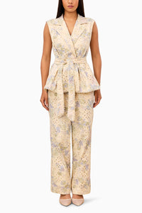 Soft ivory floral cutwork coord set with tailored peplum top and straight trousers .