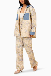 Pastel printed eyelet coord set featuring a relaxed button down jacket with denim patch pockets and cuffs, paired with matching pants