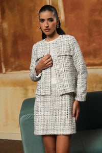 Beautifully crafted tweed dress. The skirt and the jacket are in tweed. The beauty of this dress is that one can wear the jacket as a seperate and the dress without the jacket as well.