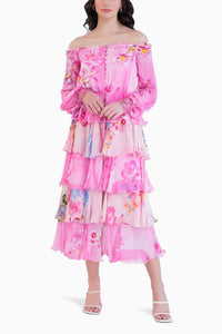 Featuring the Pastoral Mist Printed Off Shoulder Tiered Dress by Mandira Wirk's Waves of Love Collection. This enchanting pink chiffon dress features elegant off-shoulder styling, tiered layers, puff sleeves, and hand-embroidered cuffs, perfect for adding a touch of romance to any special occasion.