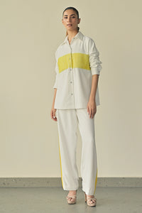 Composition- Viscose Polyester blend with Spandex Color- White Fit- Shir: Oversized, Bottom: Easy/Relaxed Components- 2 Product Code- SVESOMYASGS04C24&SGTR02BS21