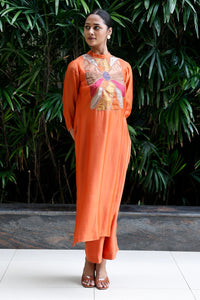 Composition: Top: Top : Viscose Silk, Bottom : Viscose Silk, Lining : Shantoon Color: Orange Embroidery: Patch Fit: Comfortable Fit Components: 2 Product Code: SVEEEDA_Orange_Patch_KurtaSet