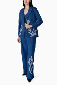 Featuring Patched denim highlighted blazer with bell bottom patched pants and denim corset