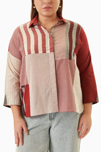 Featuring Patchwork Shirt Red Kora by Kishmish. Crafted from leftover handwoven cotton, this oversized shirt showcases a unique patchwork design in black kora checks and stripes.