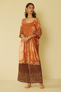 Featuring Peach Bageecha Kurta Set by Sarang Kaur by Meera Collection. This elegant ensemble features a velvet kurta paired with mushroom silk pants in a serene peach hue. Ideal for special occasions, it combines luxurious comfort with timeless style, embodying Sarang Kaur's craftsmanship.