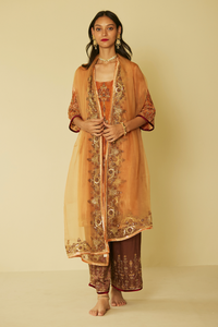 Featuring Peach Bageecha Stole by Sarang Kaur by Meera Collection. Crafted by exquisite organza silk, this stole in a soft peach hue adds a touch of sophistication to any outfit. Perfect for enhancing your ensemble with its lightweight and elegant drape.