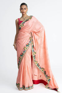This is a peach Bandhani on silk saree that comes embellished with an aari work border featuring colourful elephant motifs. A special feature of this saree is the presrnce of saree red bandhani dots in organic forms as opposed to the usual yellow and white dots. It comes clubbed with a silk Bandhani blouse piece with hand embroidery for neck, sleeves and body, also in peach.