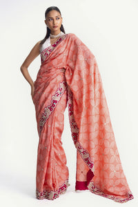 This is a peach Bandhani on silk saree that comes embellished with an pearl and mukaish work border featuring paisley motifs, on a contrast wine base. It comes clubbed with a muga silk blouse piece with hand embroidered borders for sleeves, in wine.