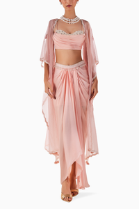Featuring Peach Blossom Blouse and Skirt Set by Mandira Wirk. Embrace elegance with this peach draped skirt, crafted from luxurious satin georgette. Paired with a chic belt, it accentuates your curves with flair. The pearl-detailed blouse adds sophistication, while the soft organza cape lends an ethereal charm.
