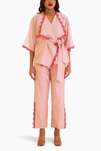A symbol of timeless elegance and grace. Crafted from delicate Chanderi fabric in a soft peach hue, this cape features intricate embroidery that adds a touch of whimsical charm. The flowing silhouette drapes effortlessly, exuding a sense of ethereal beauty and femininity. Paired with a spaghetti top and matching pants which feature intricate embroidery that adds a touch of whimsical charm. Perfect for both formal events and casual outings, ensuring you make a statement with every step.ÂÂ