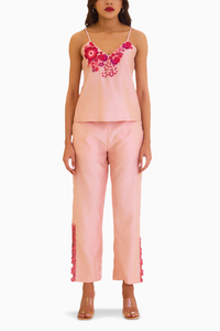 A delightful fusion of elegance and femininity. Crafted from lightweight Chanderi fabric in a soft peach hue, this spaghetti top features intricate embroidery that adds a touch of whimsical charm. With its slender spaghetti straps and delicate detailing, it exudes effortless grace and sophistication. Paired with matching pants which feature intricate embroidery that adds a touch of whimsical charm. Perfect for both formal events and casual outings, ensuring you make a statement with every step.ÂÂ