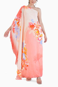 Featuring the Peach Damsel One Shoulder Long Kaftan by Mandira Wirk's Waves of Love Collection. This elegant viscose crepe kaftan showcases a stunning placement print and chic fringe detail, complemented by a stylish belt, perfect for a sophisticated and relaxed look at any event.