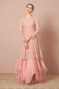 Featuring a peach organza jaal embroidered kurta in organza base. It is paired with matching 6 kali inner slip dress. The set is crafted with the finest materials and will accentuate the look.