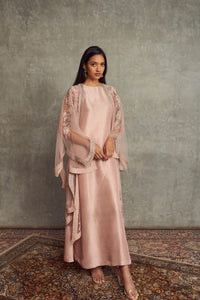 Featuring a peach embroidered cape set in silk base. It is paired with a slip. The set is crafted with the finest materials and will accentuate the look.