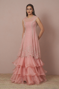 Featuring a peach organza jaal embroidered kurta in organza base. It is paired with matching 6 kali inner slip dress. The set is crafted with the finest materials and will accentuate the look.
