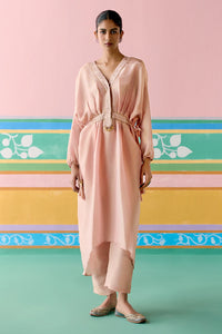 Playful yet poised, the Peach Embroidered Kaftan Set is crafted in luminous Tissue with all-over sequin work and lace inserts. Handwork on the neckline and waistband, dori tie-ups with tassels, and elasticated sleeves and pants blend sparkle and comfort for a modern festive statement.