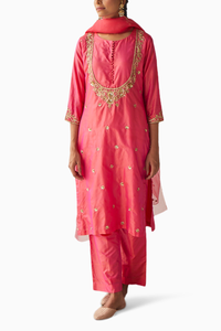 Featuring our exquisite peach silk zardozi work kurta set, epitomizing timeless elegance. Paired with matching pants, this ensemble exudes sophistication and grace. Complete your look with the organza dupatta adorned with small embroidered motifs, adding a touch of charm to your outfit.