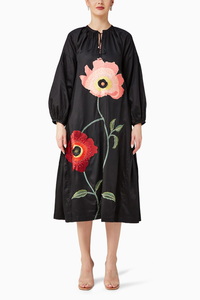 Featuring a Black A-Line Dress in cotton base with exquisite floral embroidery with resham and sequins, which is perfect for your autumn-winter wardrobe.