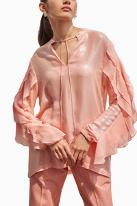 A georgette sequins shirt with ruffles on the sleeves and beautiful hand made tassels in the front. This shirt is relaxed fit in a colour to suit everyone. Perfect for evenings out and day occasions too. Match it with our peach shiny cotton pants and you are all set to shine.