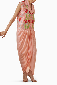 This jacket is an embroidered waistcoat with beautiful 3D flowers. It’s inspired by the beauty of the tropical flowers. It’s perfect for wedding and special occasions. Pair it with our matching sequins drape skirt in georgette fabric Ã¢ÂÆ’ Skirt has half lining of cotton voil fabric and your outfit is complete.
