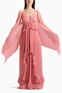 Dazzle in our Peach Georgette Pleated Dress. Enhanced with pearl detailing and graceful cape sleeves, this dress combines sophistication and charm for a timeless and enchanting look.