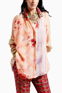Elevate your style with our Peach Mandala Shirt. Crafted from natural crepe, its anti-fit design offers comfort for all sizes. Featuring intricate Resham thread embroidery, trapeze shape, and unique collar details.