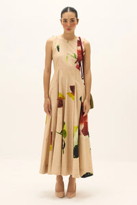 A flowing sleeveless Melba dress crafted in soft printed poplin, featuring delicate pintucks that run seamlessly from top to bottom, creating a lengthening silhouette. The dress is adorned with bold painterly floral motifs in vivid hues, adding a touch of artistic elegance against its neutral base.