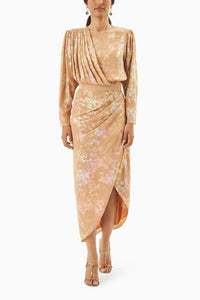 Peach Metallic Print Draped Dress