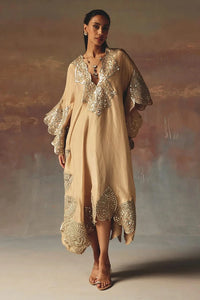Featuring a peach V-neck kaftan adorned with intricate mirrorwork and detailed patchwork, this piece blends traditional craftsmanship with effortless grace — perfect for festive and special occasions.