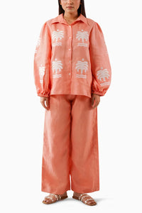 Discover the beauty in the details with our Palm Drift Co-ord Set – a creation born from dreamy linen fabric. Its calming peach tones and intricate palm-inspired patterns will whisk you away to charming beaches and towns for the perfect vacation. It's a versatile piece with elasticised cuffs that effortlessly blend comfort and serenity, allowing you to drift through your day with bliss. Paired with the long relaxing pants, you'll achieve the ultimate laid-back yet refined workwear look.
