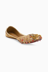 Featuring Peach Peacock Love Juttisby 5 Elements by Radhika Gupta. This exquisite gold juttis adorned with an intricate goota work in vibrant colours with peacock and ghungroo embellishment. Glossy gold base with multicolour work with finest embroidery done with dori and sequins! You are definitely going to fall in love with the finery and intricate work of this pair.