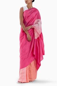 Featuring handwoven handsfree silk saree dyed in a pink ombre with our signature shibori sleeve detail on the pallav. It comes with an unstitched pink silk blouse piece.