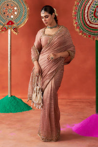 Leher features a peach pink saree paired with a peach pink blouse, crafted in pure silk tissue. A delicate dusting of golden sequin embroidery adds soft luminosity, making it an elegant choice for a wedding function or a refined card party.