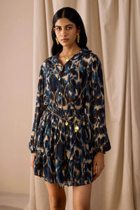The Peach Mini Skirt is a playful, tiered silhouette crafted in viscose georgette with a blue-hued abstract print and vertical lurex lines that add the perfect touch of glam. Fully lined for comfort, it’s designed with an all-round elasticated waistband for ease, movement, and effortless styling. Flowing and flirty, this versatile mini pairs perfectly with the matching Carter Shirt or styled solo for a chic statement.