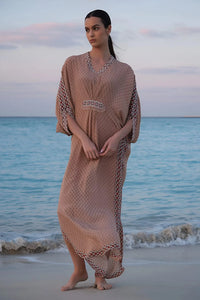 Add a touch of feminine charm with this peach-printed kaftan, featuring delicate moti work that enhances its graceful appeal. Perfect for relaxed gatherings or elegant daywear, this kaftan offers effortless style with a soft, sophisticated finish.