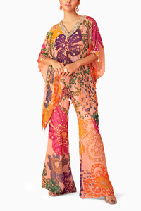 Imagine stepping into a world of effortless elegance with the Peach Printed Organza V-neck Embellished Kaftan, a masterpiece of contemporary fashion. Crafted from delicate organza, this kaftan drapes gracefully, featuring intricate embellishments that shimmer in the light, adding a touch of luxury to your ensemble. Paired flawlessly with Bellbottom Pants, the outfit exudes a harmonious blend of sophistication and modernity.