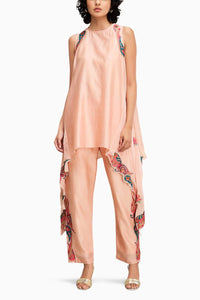 The Peach Qala Appliqued Asymmetric Kurta features intricate applique detailing, creating a modern yet elegant look. Paired with matching pants in linen, this ensemble offers a stylish blend of comfort and sophistication, perfect for both casual and semi-formal occasions.