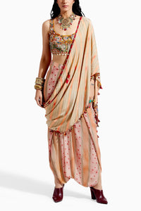 Experience grace with our Peach Sadhavi Drape Saree. Made from natural crepe, its relaxed fit features a stripe print and tribal tassel detailing on the pallu.