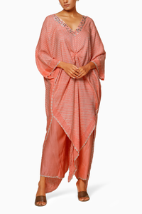 Featuring a Peach Sakura Set V-neckline kurta with front knot paired with straight palazzo pants.