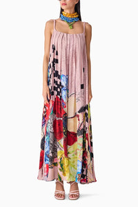 Featuring the Peach Vintage Block Swing Dress by Saaksha & Kinni's Nirah Collection. This flared maxi dress showcases a striking floral and abstract print with a flattering square neckline, exuding effortless elegance and timeless charm.