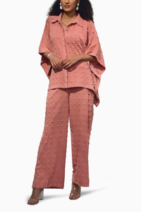 This peach kaftan shirt with front opening. Shirt collar with and side buttons. Wide leg pants with a slit at the hem and with show buttons. Relaxed fit for any brunch date.