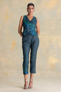 Peacock Veil Waist Coat Co-ord Set is crafted in a breathable linen blend, featuring a sleeveless V-neck waistcoat with a button-down front and delicate foiling with cotton thread embroidery from armhole to hem. Paired with straight pants with matching detailing, it offers a comfort fit with modern structure and subtle shimmer for festive and evening occasions.
