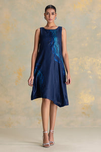 Peacock Veil Celine Dress is crafted in a breathable linen blend, featuring a round neckline and a high-low asymmetric hem. Accented with delicate foiling embroidery running from armhole to waist and along one side to the hem, it offers a comfort fit with effortless elegance and modern shimmer for festive and evening occasions.