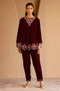 Crafted from rich velvet fabric, the kurta offers a plush texture that reflects light, exuding luxury. Its deep maroon hue adds warmth and regality, while the intricate peacock embroidery adds an artistic and sophisticated touch. Paired with flowy, wide-leg pants, this ensemble creates a chic and effortless look, making it a perfect choice for weddings, festivals, or any grand celebration.
