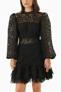 Crafted from black-hued guipure lace, this sophisticated little black number features a fit and flare silhouette complemented by a mock turtleneck with scallop lace, full sleeves and a double-tiered hem.