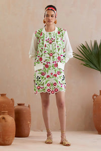 The Pearl White and Multi-Color Thread Embroidery Jacket is crafted from smooth ivory crepe, showcasing intricate multi-color thread embroidery with a pearl white finish. This elegant jacket adds a refined touch to any outfit, perfect for daily wear or vacation. Its lightweight and stylish design makes it a versatile layering piece, offering both comfort and sophistication.