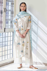 The classic ivory kurta is adorned with skilled floral applique and threadwork. The pants feature a floral hem and a floral printed dupatta in the hue of sky detailed with tassels. The intricate details in this set elevate the ensemble.