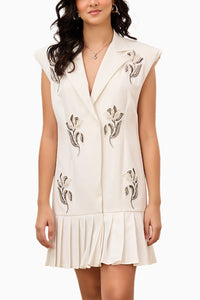 Ivory short dress featuring delicate floral embroidery and pleated hem line.